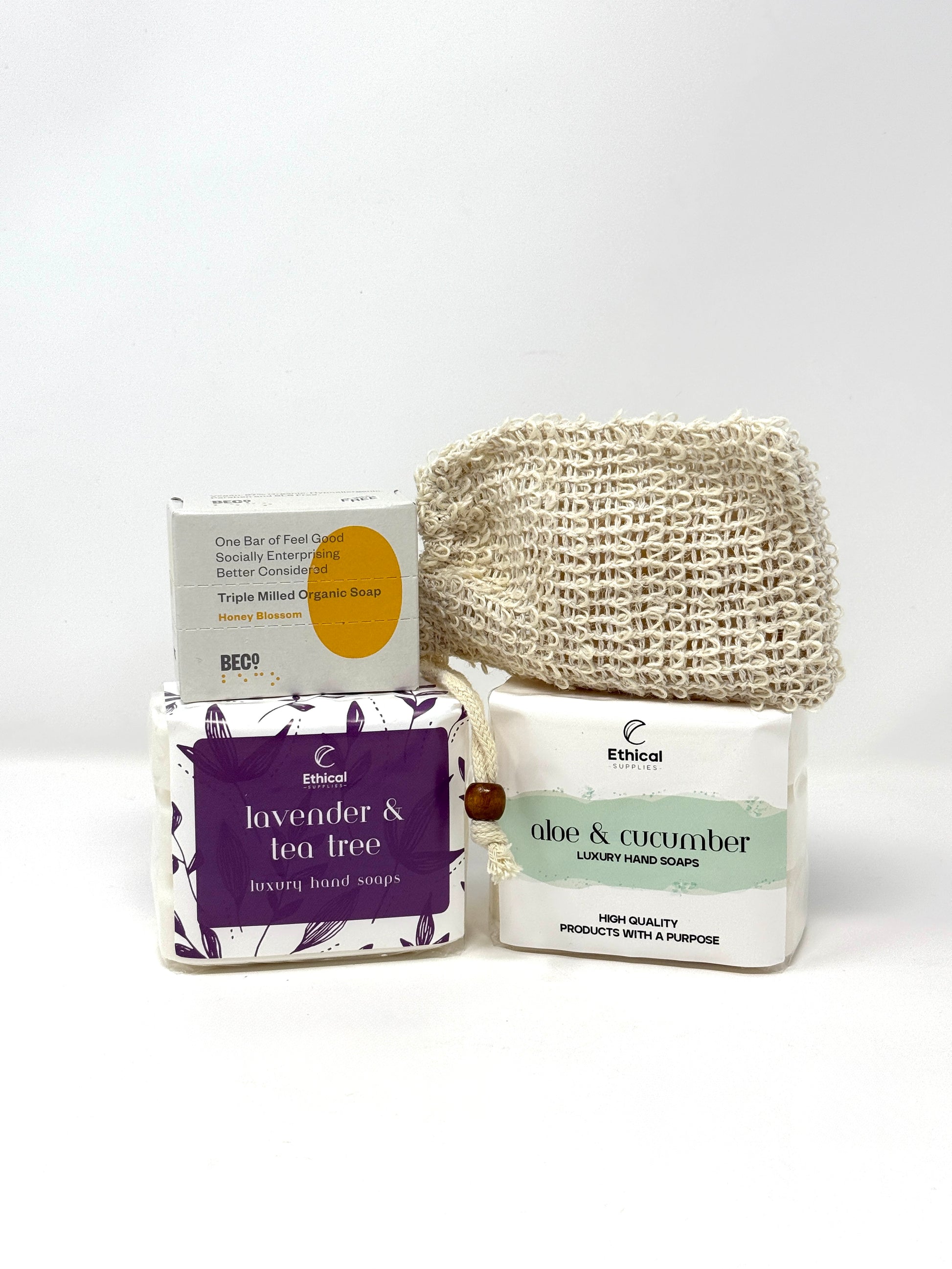 Delight in refined indulgence with the Simply Soap Gift Bundle, comprising a trio of soothing Lavender & Tea Tree soaps, three refreshing Aloe & Cucumber soaps, and a single Honey Blossom Organic Beco Soap. Included is a Buttermilk soap nestled within an exfoliating natural sisal mesh bag. This elegant collection makes an ideal luxurious gift for someone truly special.
